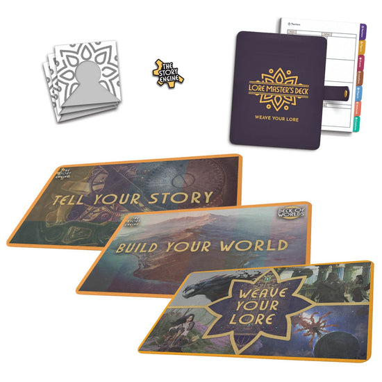 Generate endless stories, explore limitless horizons, and spin eternal lore with the ultimate storytelling, worldbuilding, and lore weaving bundle. This 2,208-card collection comes with The Story Engine Deck, Deck of Worlds, and Lore Master’s Deck, along with every single booster and expansion we’ve released with all three systems—along with enamel pins, storage boxes, a lore journal, specialized focus sleeves, and deluxe playmats for easy handling!