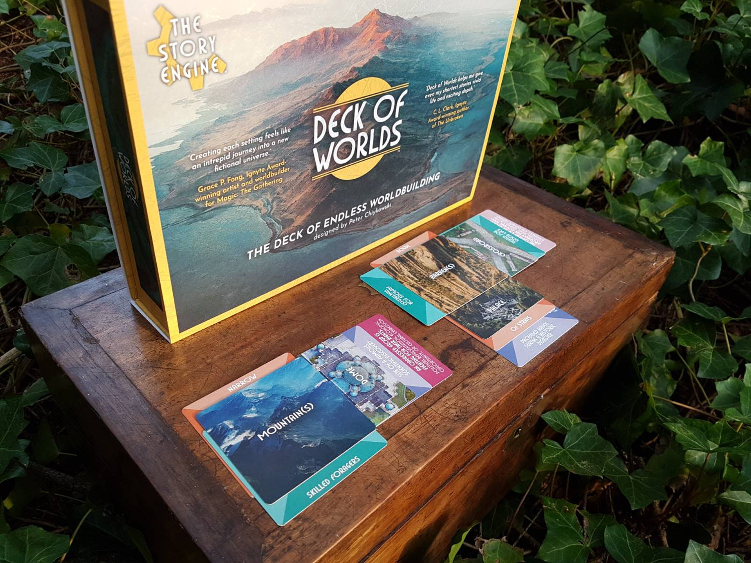 The Story Engine Deck focuses on characters, themes, and plot hooks that drive your narrative forward. Deck of Worlds specializes in settings and world functions that make your fictional environments feel alive and authentic.