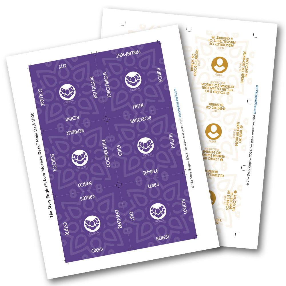 The files include high-quality layout cards (6 cards per page) and eco-friendly (12 cards per page) versions of the deck, along with the guidebooks and instructions for printing and assembling your copy of Lore Master's Deck.