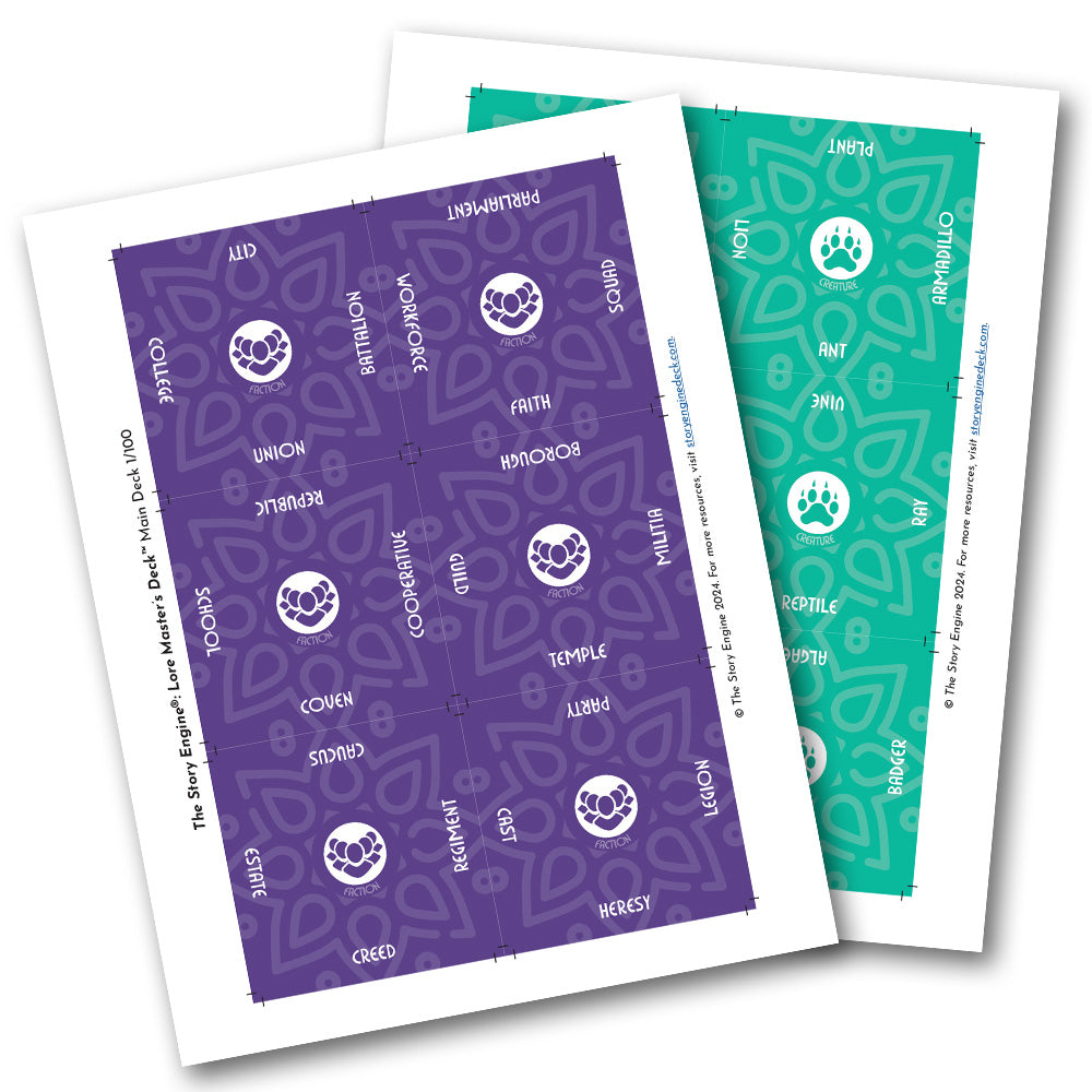 The files include high-quality layout cards (6 cards per page) and eco-friendly (12 cards per page) versions of the deck, along with the guidebooks and instructions for printing and assembling your copy of Lore Master's Deck.