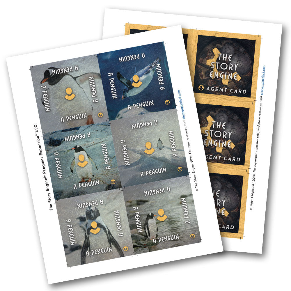 Receive instant access to print-and-play PDFs of the most-anticipated expansion in the history of The Story Engine: the Oops, All Penguins!: Penguins Expansion.