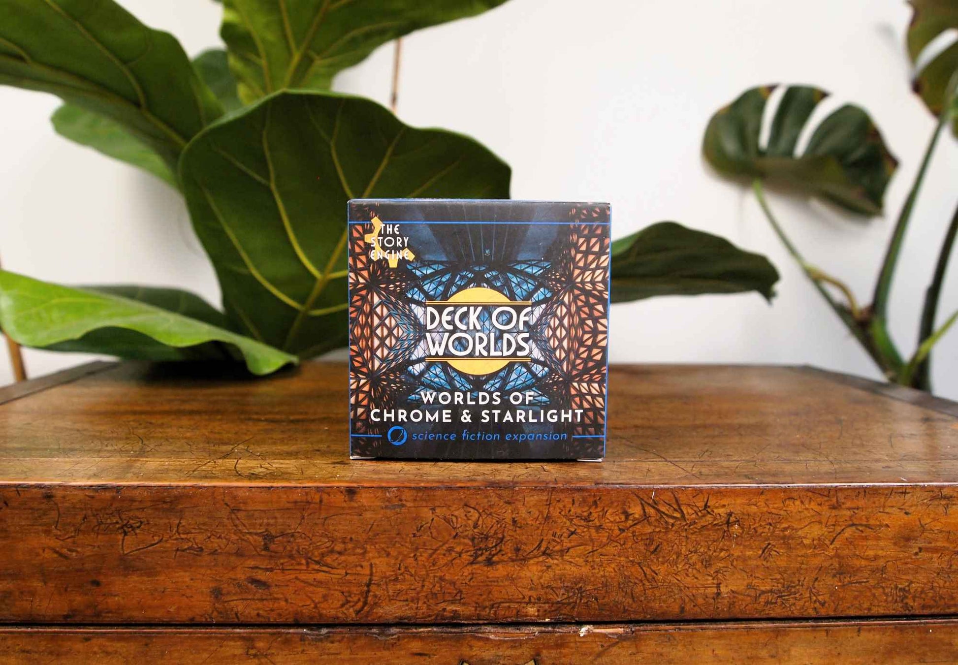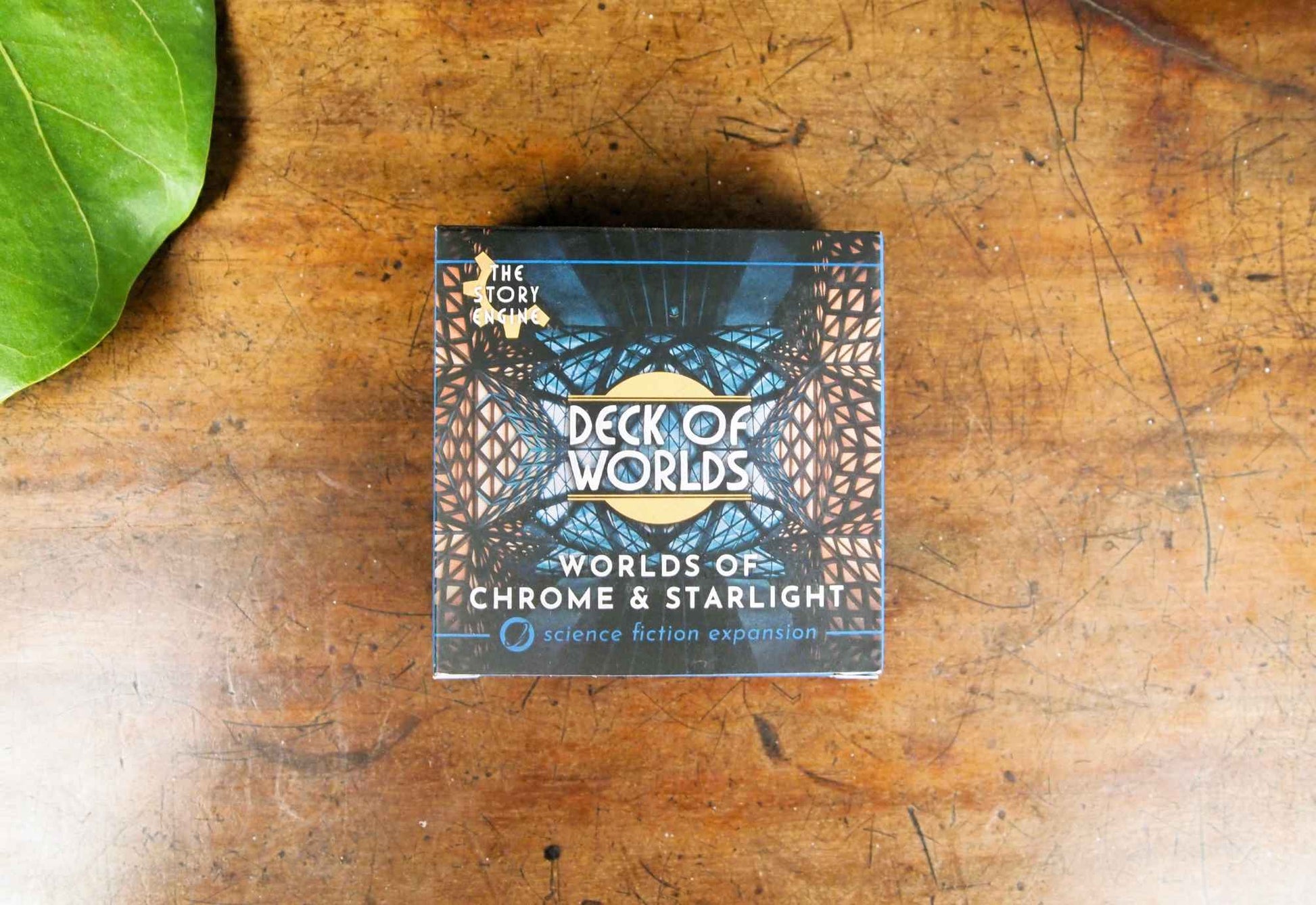 Terraform your planet with this 60-card sci-fi expansion for Deck of Worlds. These futuristic prompts cover your world with seedy spaceports, alien hives, and mysterious space-time anomalies. Explore all the galaxy has to offer with Worlds of Chrome and Starlight.