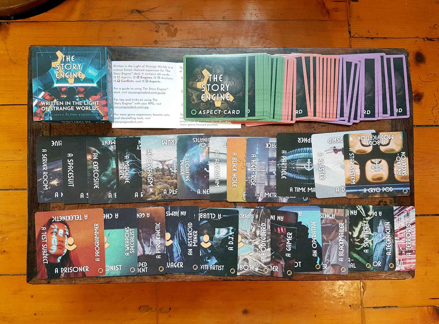 You can use this expansion to create ideas for your sci-fi novel or TTRPG campaign, which you can further develop into a full story. You do this by drawing one card from each of the five main categories - Agents, Engines, Anchors, Aspects, and Conflicts - and combining their different elements to form your story prompt.
